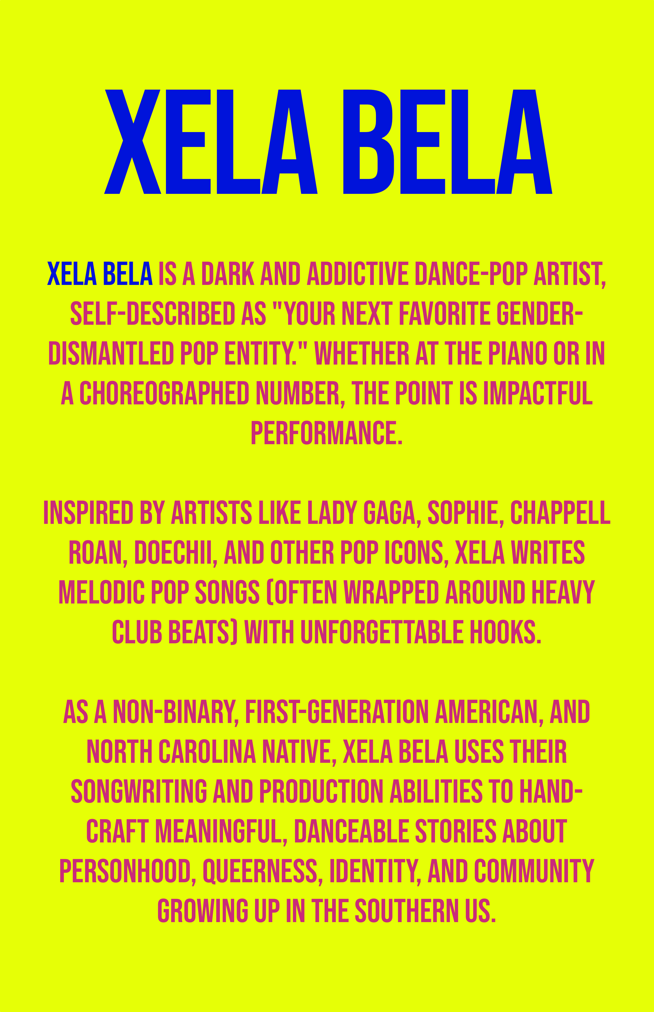 BEFORE THE CREATION OF Xela Bela, I WENT BY Joseph Alexander AND RELEASED QUITE A FEW RECORDS WHEN I WAS YOUNGER. I WAS ONCE THE RAINBOW SPOTLIGHT ARTIST ON Willam + Alaska’s PODCAST, HAD SOME MOMENTUM GOING, AND GOT SUCKED INTO WORK AND LIFE CHANGES AND LOST MY WAY. I STILL LOVE WHAT I CREATED AS Joseph, SO TAKE A LISTEN TO Xela’s PREDECESSOR.
